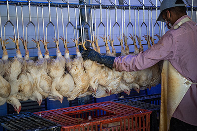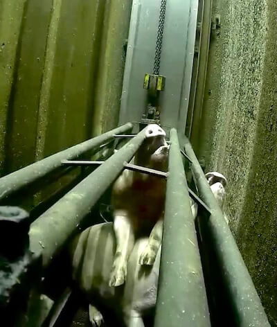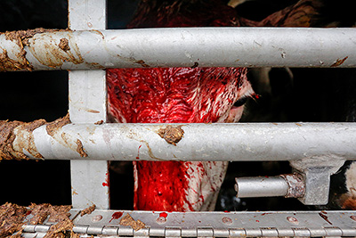 Alle Tiere erwartet ein qualvolles Ende. Bei vollem Bewusstsein an den Füßen aufgängt, werden sie durch ein „Elektrobad“ gefahren. Hier erhalten sie am Kopf einen elktrischen Schlag, der sie betäuebn soll, bevor sie durch die Schneidemesser gefahfen werden, die ihnen den Kopf abtrennen (Bild 8). Verletzte Pute, Tierschutzskandal aufdecket durch SOKO Tierschutz (Bild 9).