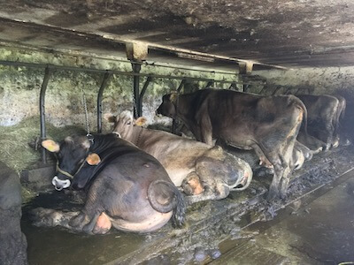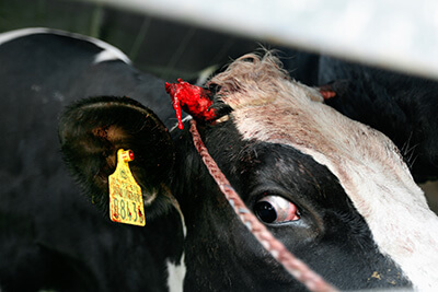 Kühe sind sanfte Riesen. Nur weil sie uns vertrauen, werden sie ausgebeutet. Wusstest du, dass (Milch-)Kühe künstlich besamt werden, damit sie Milch geben? Die künstliche Befruchtung ist oft so schmerzhaft, dass die Kuh an allen vier Beinen festgebunden werden muss, bevor der Tierarzt die Gebärmutter befruchtet (Bild 1).