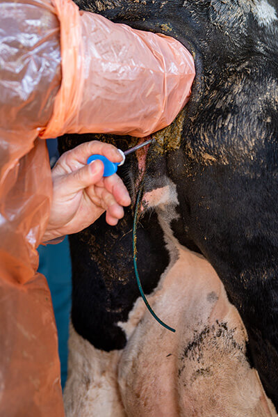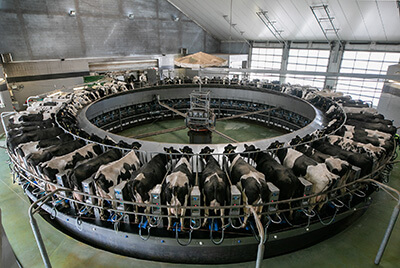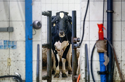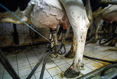 Zwangszuführung von Nahrungsergänzungsmitteln, während die Kuh arretiert ist (Bild 8), als auch die lebenslange Anbindehaltung, wie sie u.a. in Bayern praktiziert wird, sind legal (Bild 9). Bis zum Bersten gespannte Milcheuter schmerzen die Milchkühe (Bild 10), die in Melkkarussels gemolken werden (Bild 11).