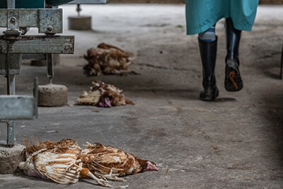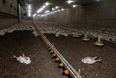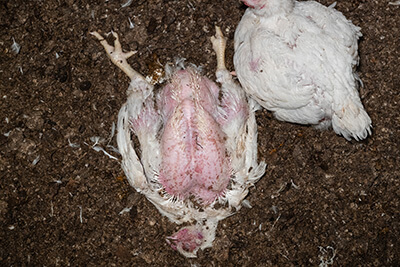 In Ställen mit mehreren Tausend Tieren müssen die sensiblen Lebewesen ausharren bis zu ihrer Schlachtung. Ob Bodenhaltung, (Bild 1) oder Käfighaltung (Bild 2): Ihre Schnäbel werden oft ohne Betäubung „gekürzt“, damit sie sich in den engen Käfigen nicht hacken. Kranke oder verletzte Tiere leiden unbehandelt. Oft sterben sie (Bild 3). Die Kadaver werden erst entdeckt, wenn die noch lebenden Tiere zur Schlachtung abgeholt werden (Bild 4).