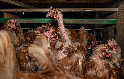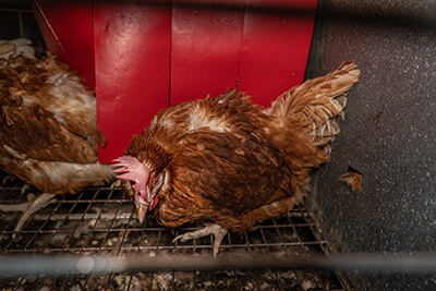 Zusammengepfercht warten sie auf „Schlachtreife“ oder darauf, dass ihre Zeit als Legehennen endet (Bild 5 und Video). Ihre Füße sind vom Stehen auf Käffiggitter qualvoll deformiert (Bild 6); jeder Schritt schneidet ein.