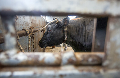 Eine Kuh mit einem blutüberzogenen Gesicht schaut hinunter, während sie in einem Transportwagen steht