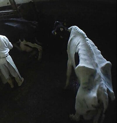 Das Kälbchen, das in den Mutterkühen heranwächst und geboren wird, wird oft bereits eine Stunde nach der Geburt (Bild 2) von seiner Mutter getrennt (Bild 3). Das kleine Herdentier wird völlig verängstigt alleine in eine Box gesperrt (Bilder 4/5) und mit Ersatznahrung gefüttert. Mutter und Kalb schreien tagelang nacheinander, bis sie aufgeben (Video, aufgenommen in Spanien).